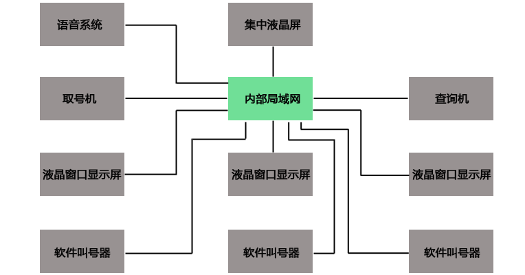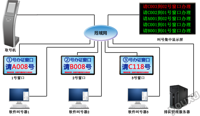 系统硬件方面主要由取号机、集中液晶屏、液晶窗口显示屏、语音系统、线缆连接部件及其他辅件等组成。本系统软件方面主要包括系统排队管理软件和软件叫号器。